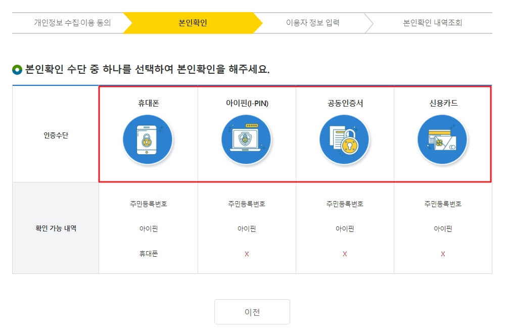 e프라이버시 클린서비스는 본인확인 수단 중 한 가지를 골라 인증을 해주셔야 진행이 가능합니다. 휴대폰, 아이핀, 공동 인증서, 신용카드를 이용한 본인 확인이 가능합니다. 수단별 확인 가능 내역에 차이가 있기 때문에 상단 내용을 참고하셔서 본인 인증 과정을 진행해주시길 바랍니다.