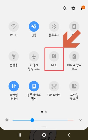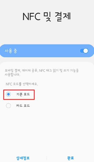 안드로이드폰 기준 핸드폰 배경화면에서 손가락으로 배경을 터치한 뒤 하단으로 내려주시면 상단과 같은 화면을 확인하실 수 있을 텐데요. 'NFC' 메뉴를 클릭한 뒤 '기본 모드'를 클릭해줍니다. 카드 모드가 아닌 기본 모드를 선택하셔야 한다는 점을 꼭 숙지하시길 바랍니다.