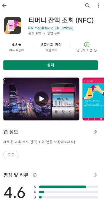 두 번째 방법은 모바일 앱을 이용한 티머니 잔액조회 방법입니다. 안드로이드 기준 '티머니 잔액 조회 (NFC)' 어플을 다운로드하신 뒤에 설치를 완료해주셔야 합니다. 다운로드하신 뒤에 해당 어플을 실행하시면 상단의 화면을 확인하실 수 있는데요. 모바일 티머니 잔액조회를 하기 위해서는 휴대폰 설정에서 NFC 기능을 ON으로 켜서 활성화해주셔야 잔액조회를 하실 수 있습니다.
