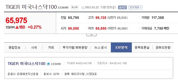 만약 해외 ETF에 투자하고 싶을 경우, 우리나라 KODEX 200과 비슷한 구성으로는 'TIGER 미국나스닥 100'이 있습니다. 미국의 우량 기업 100개를 선정하여 하나의 상품으로 구성해놓은 상품입니다.
