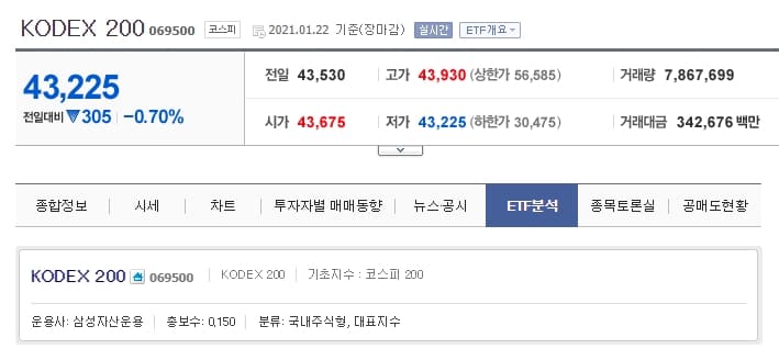 우리나라의 대표적인 ETF 종목으로 'KODEX 200'이 있습니다. 코스피 시장에 상장되어 있는 국내 기업 중 시가총액을 기준으로 시가총액이 가장 많은 1위부터 200위까지의 기업들을 모아서 이 200개 우량 기업들에 분산투자를 하는 것입니다.