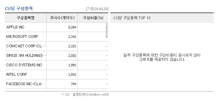상세한 구성 비중은 나오고 있지 않지만 주식수를 보면 대략적인 구성비중을 알 수 있겠죠? 1위 기업은 애플, 2위는 마이크로소프트, 6위와 7위에는 인텔과 페이스북도 보이는 것을 확인하실 수 있어요. 여러분이 이미 잘 알고 있는 해외 기업들이죠?