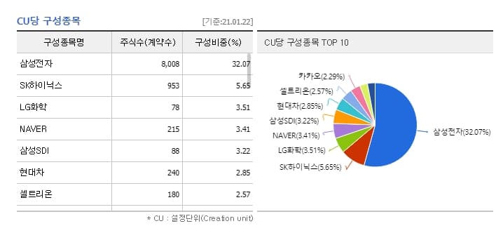 KODEX 200 구성비중을 잠깐 살펴보면 삼성전자의 구성비중은 32.07%, SK하이닉스의 경우 5.65%로 1위 기업부터 쭉 내림차순으로 정리되어 있는 것이 보이시죠?