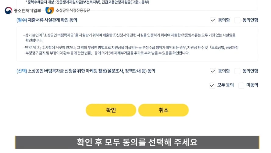 소상공인 버팀목자금 홈페이지에 들어가신 뒤 '신청하기' 버튼을 눌러주시고, 개인정보 동의에 동의해주시면 됩니다. 마지막 항목인 마케팅 활용 동의란에는 동의안함을 해주셔도 상관없습니다.