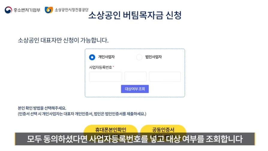 휴대폰이나 공동인증서를 통해 본인 확인 절차를 거쳐주세요. 만약 대표자 1인이 일반업종과 특별피해업종을 함께 운영하실 경우에는 사업체 1개에만 지원이 되기 때문에 지원금액이 큰 특별피해업종을 기준으로 신청하셔야 합니다.