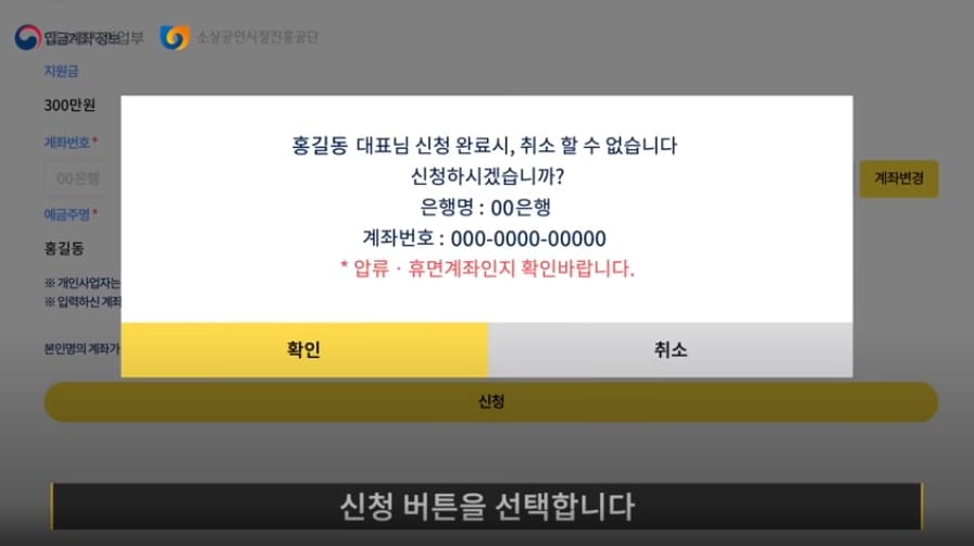 신청자명, 입금계좌, 지급액을 마지막으로 꼼꼼히 확인하신 뒤에 확인을 누르시면 소상공인 버팀목자금을 수령할 준비가 끝났습니다.