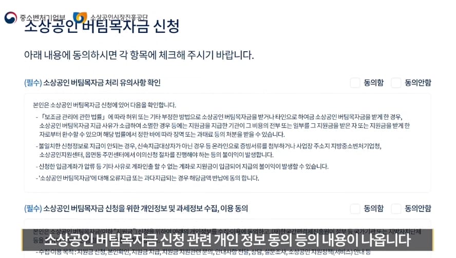 소상공인 버팀목자금 홈페이지에 들어가신 뒤 '신청하기' 버튼을 눌러주시고, 개인정보 동의에 동의해주시면 됩니다. 마지막 항목인 마케팅 활용 동의란에는 동의안함을 해주셔도 상관없습니다.
