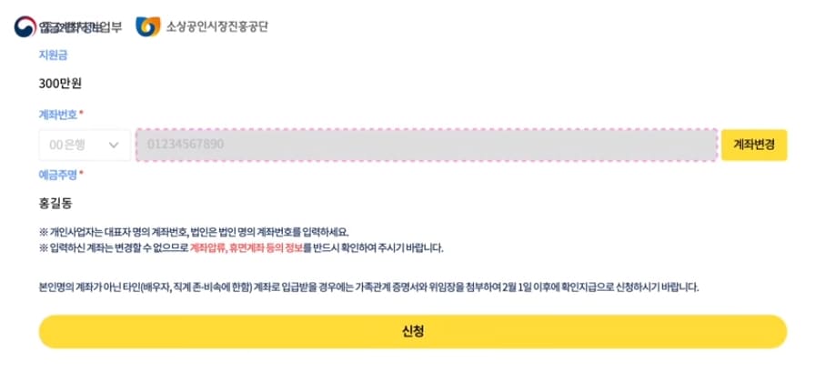 이전에 새희망자금을 받으셨을 경우에는 기존에 수령한 계좌 번호가 자동으로 뜨게 되는데, 만약 계좌를 변경하고 싶다면 다른 계좌번호를 입력하신 뒤에 계좌 변경 버튼을 눌러주시면 됩니다.