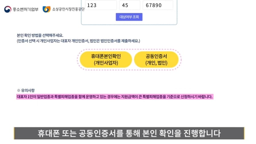 휴대폰이나 공동인증서를 통해 본인 확인 절차를 거쳐주세요. 만약 대표자 1인이 일반업종과 특별피해업종을 함께 운영하실 경우에는 사업체 1개에만 지원이 되기 때문에 지원금액이 큰 특별피해업종을 기준으로 신청하셔야 합니다.