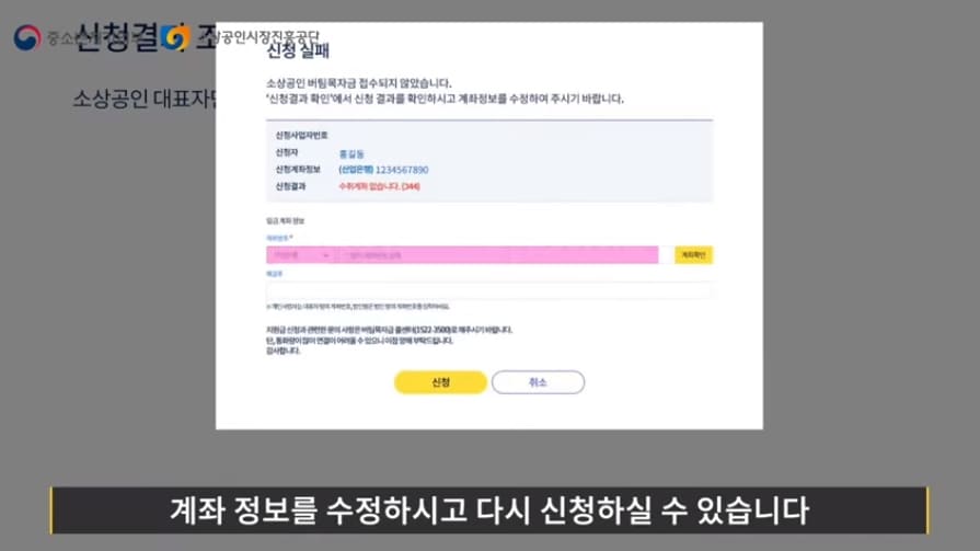 만약 소상공인 버팀목자금 신청 오류가 발생했을 경우 홈페이지에 다시 접속해주세요. 홈페이지상의 신청결과 확인을 통해 계좌 정보를 수정한 뒤 다시 신청하실 수 있습니다.