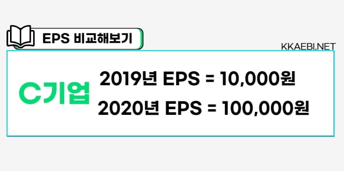 C기업의 EPS가 2019년도엔 1만원이었는데, 1년 후인 2020년에는 10만원이 되었습니다. 그럼 EPS가 10배가 된 것이고, 즉 C기업의 영업이익이 10배가 늘어났다는 것으로 판단하시면 됩니다.