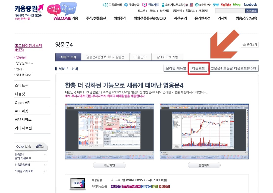 2. 클릭하자마자 뜨는 화면상에서 상단 이미지 화살표가 가리키고 있는 '다운로드' 버튼을 클릭해줍니다. 키움증권 영웅문 4를 다운로드하실 수 있어요.