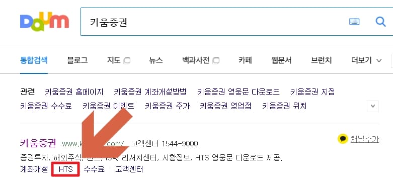 1. 우선 포털 사이트에 '키움증권'을 검색해주세요. 최상단의 공식 홈페이지 하단의 소제목으로 'HTS' 메뉴를 확인하실 수 있을 텐데 클릭해주세요.