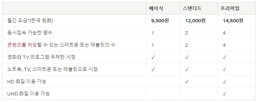 베이식 요금제는 매월 9,500원에 이용이 가능합니다. 하지만 동시접속 가능한 인원이 1명이고, 콘텐츠를 저장할 수 있는 기기 수가 1대만 지원됩니다. 또 UHD 화질은 물론 HD 화질조차 지원되지 않기 때문에 저화질로 영상을 감상하시게 됩니다.