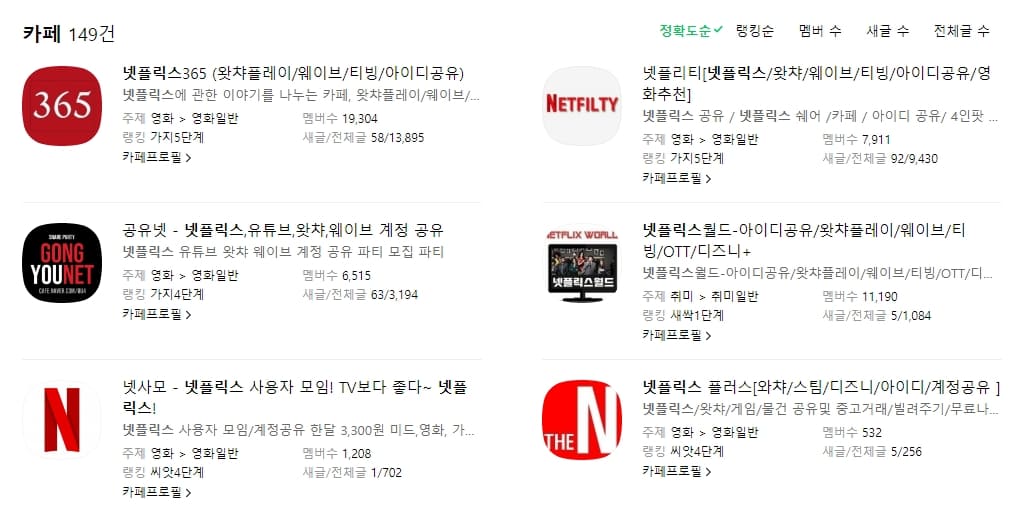 만약 주변에 같이 볼 만한 지인이 없다고 해도 걱정할 게 없습니다. 요즘은 넷플릭스, 왓챠 등의 스트리밍 서비스를 함께 공유할 사람, 즉 파티원을 구해 아이디를 공유하는 문화가 활발해졌습니다. 따라서 네이버 검색창에 '넷플릭스'만 검색하더라도 관련 카페를 다수 발견하실 수 있습니다.