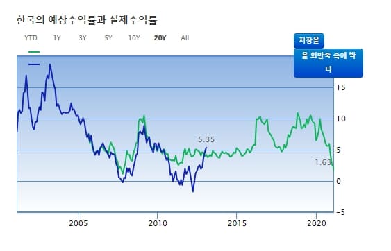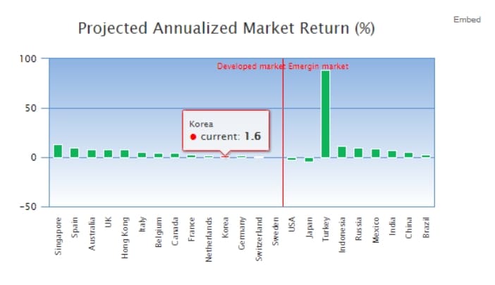 구루포커스 사이트에서는 향후 증시 수익률의 예측 결과도 제공하고 있습니다. 우리나라의 수익률을 향후 몇 년간 1.6퍼센트의 수익률을 보일 것으로 예측하고 있네요. 하지만 주식 시장은 변수가 워낙에 많기 때문에 정답이라고 볼 수도 없습니다. 참고만 하시면 될 듯하네요.