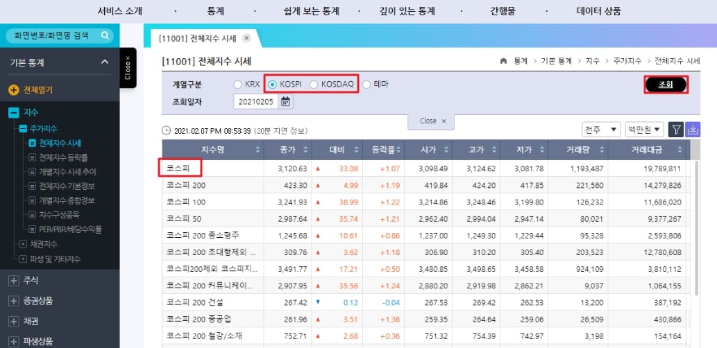 계열 구분 중에서 KOSPI와 KOSDAQ를 각각 조회해보시면 코스피 시가총액과 코스닥 시가총액을 각각 확인하실 수 있습니다.