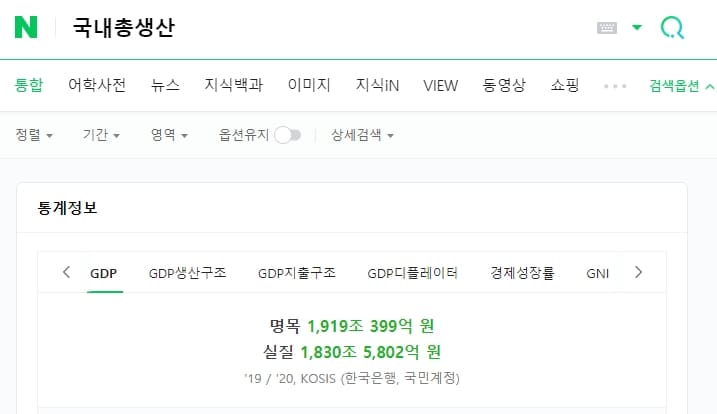 이제 국내총생산(GDP)를 확인하러 가볼까요? 포털 창에 '국내총생산'을 검색하시면 바로 확인이 가능하십니다.
