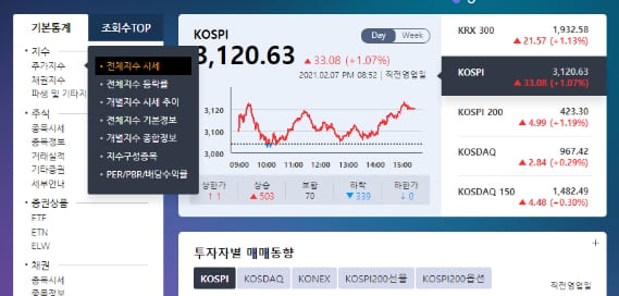메인 화면에서 왼쪽 메뉴 중에서 '지수' > '주가지수' > '전체지수 시세'로 들어갑니다.
