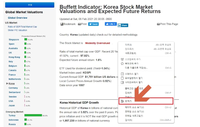 버핏지수 보는 곳으로 구루포커스라는 해외 사이트가 있습니다. 영어로 되어있지만, 파파고 등의 번역기를 돌리면 쉽게 해결될 문제입니다. 하단 버튼을 클릭하시면 구루포커스에서 한국의 버핏 지수를 볼 수 있는 페이지로 바로 이동합니다.