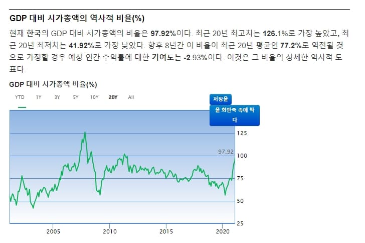 버핏지수 보는 곳인 구루포커스 사이트에서 확인해보니 필자가 글을 작성하고 있는 현재 시점 기준으로 대한민국의 버핏지수는 97.92퍼센트로 확인되고 있네요. 구루포커스 사이트에서 제공하는 버핏지수 판단 기준으로 현재 우리나라는 중간 정도 고평가된 상황이라고 분석되고 있습니다.