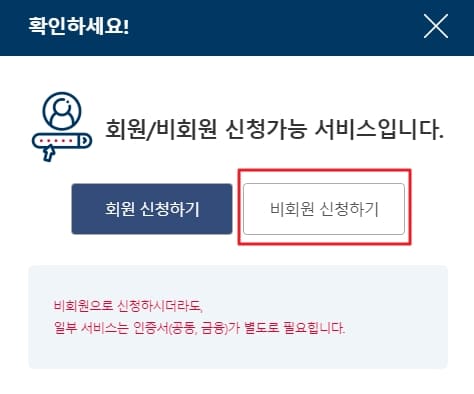 4. 새 창으로 회원, 비회원 신청하기 버튼을 확인하실 수 있습니다. 정부24에서는 굳이 회원가입을 하지 않고도 비회원으로 서비스를 제공받을 수 있습니다. 필자는 비회원으로 신청하기를 클릭했습니다.