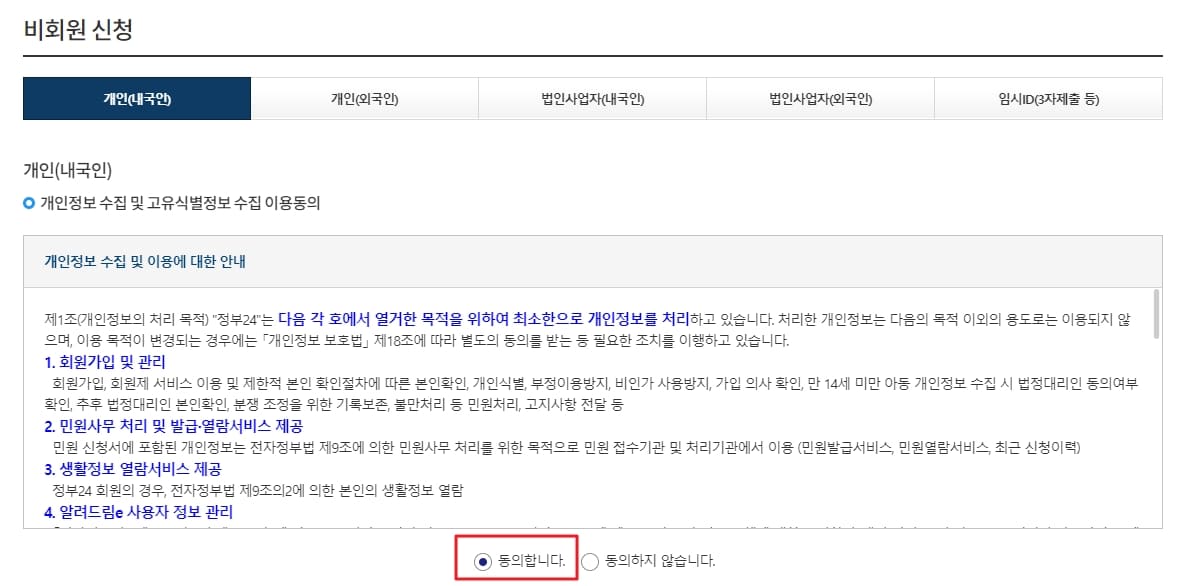 개인정보 수집 및 고유식별정보 수집 이용 동의란을 확인하신 뒤 모두 동의합니다를 체크해주세요.
