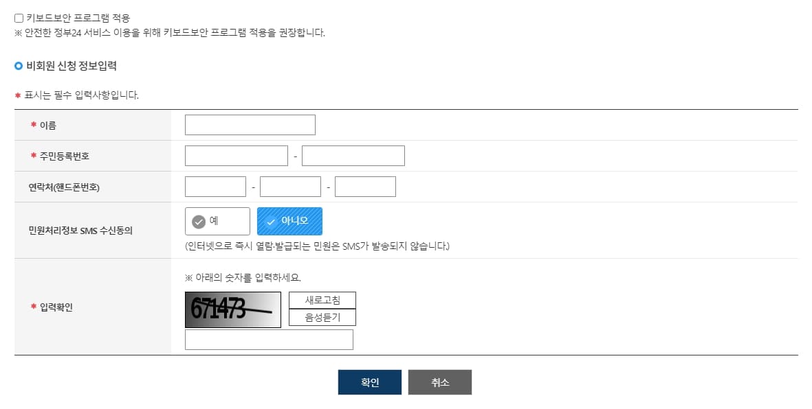 그리고 비회원 신청 정보를 입력해주세요. 필수 입력사항인 이름, 주민등록번호, 입력확인으로 숫자를 입력하신 뒤 확인 버튼을 눌러주시면 됩니다.