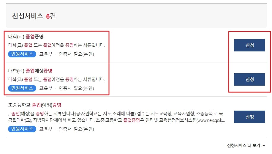 3. 정부24에서 제공하는 신청 서비스 6건을 확인하실 수 있습니다. 최상단의 대학교 졸업증명 메뉴의 '신청' 버튼을 클릭해줍니다.