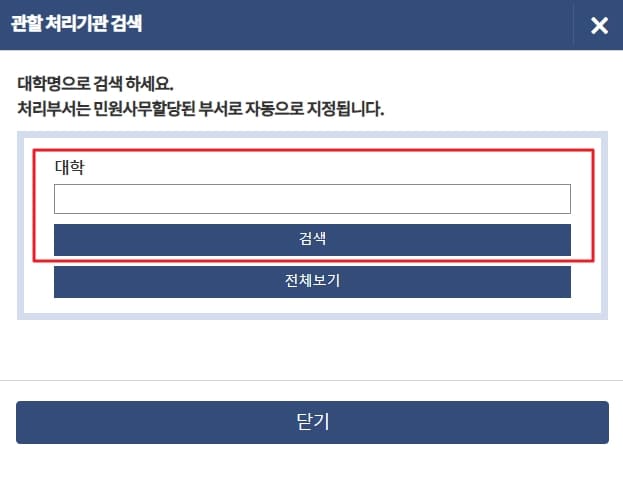 학교 검색 버튼을 클릭하면 새 창으로 관할 처리기관 관련창이 뜹니다. 여러분이 졸업한 대학교명을 입력한 뒤 검색해주면 대학교명이 뜨는 것을 확인하실 수 있습니다.