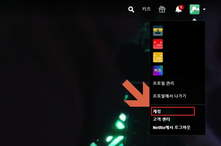 넷플릭스에 접속하셔서 로그인하신 뒤에 메인 화면 기준 오른쪽 우측 상단의 프로필을 클릭하셔서 '계정' 메뉴로 들어가주세요