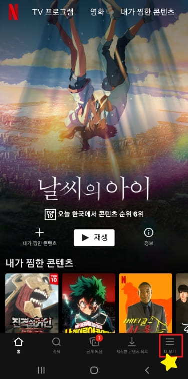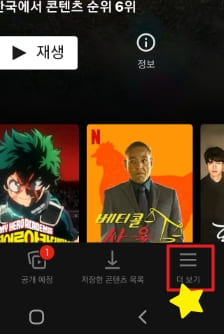 휴대폰으로 넷플릭스 어플을 실행하시면 메인화면이 보이실 텐데요. 로그인한 상태에서 화면 하단의 맨 우측에 있는 '더 보기' 메뉴를 클릭해줍니다.