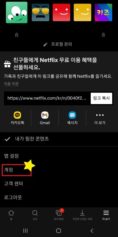 더 보기 메뉴로 들어가셔서 앱 설정 바로 밑의 '계정'을 클릭해주세요.