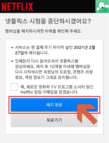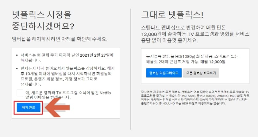 모바일과 동일하게 넷플릭스 시청을 중단하겠냐는 문구를 확인하실 수 있습니다. '해지 완료' 버튼을 클릭하시면 끝!