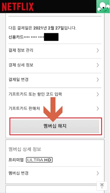계정 메뉴 안의 '멤버십 해지' 버튼을 클릭해줍니다.