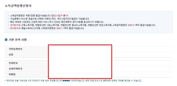 소득금액증명 신청서 작성을 위한 기본 인적 사항을 꼼꼼하게 기입해주세요.