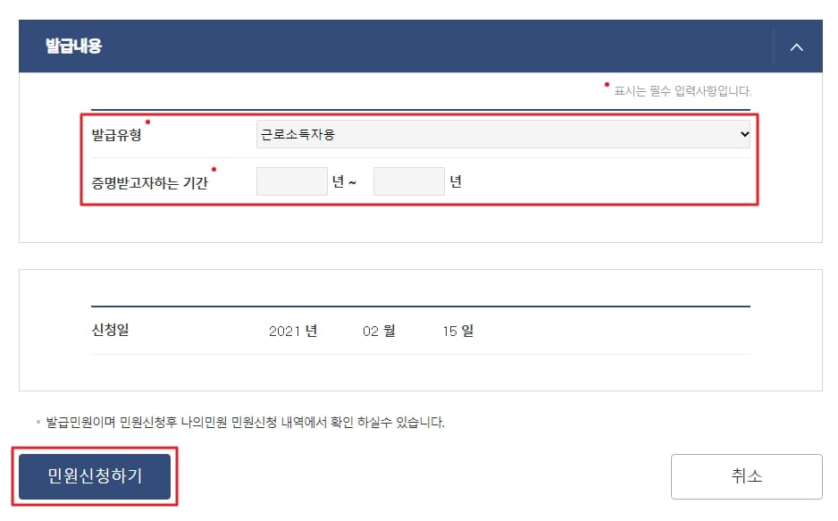 발급 내용란에서 발급 유형과 함께 증명받고자 하는 기간을 입력해줍니다.