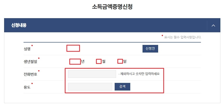 신청 내용에는 성명, 생년월일, 전화번호, 그리고 소득금액증명신청 제출 용도를 선택해줍니다. '검색' 버튼을 클릭하면 관공서 제출용, 금융기관 제출용, 여권 또는 비자 신청용 등 용도별 선택이 가능하니 참고해주세요.