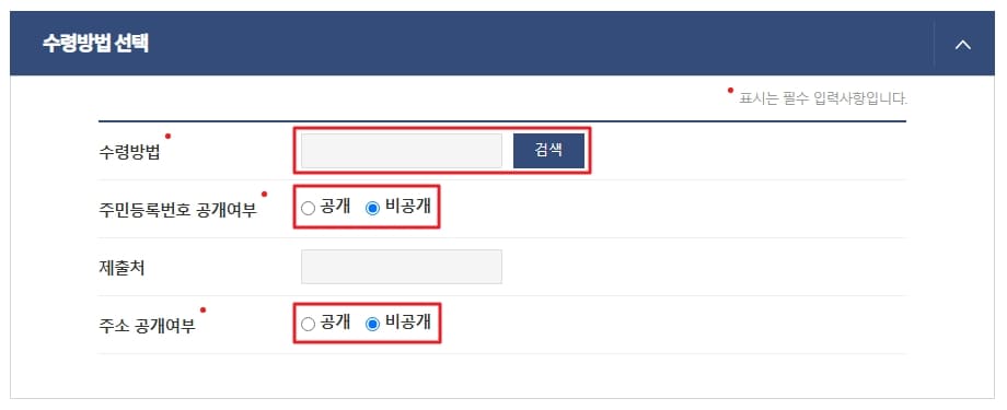 수령방법 선택란도 꼼꼼히 기입해줍니다.