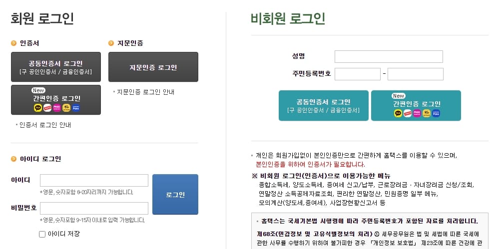 회원 로그인과 비회원 로그인 중 선택하셔서 진행 가능합니다. 정부24와 마찬가지로 소득금액 증명서 인터넷 발급을 위해서는 공동인증서가 필요합니다.