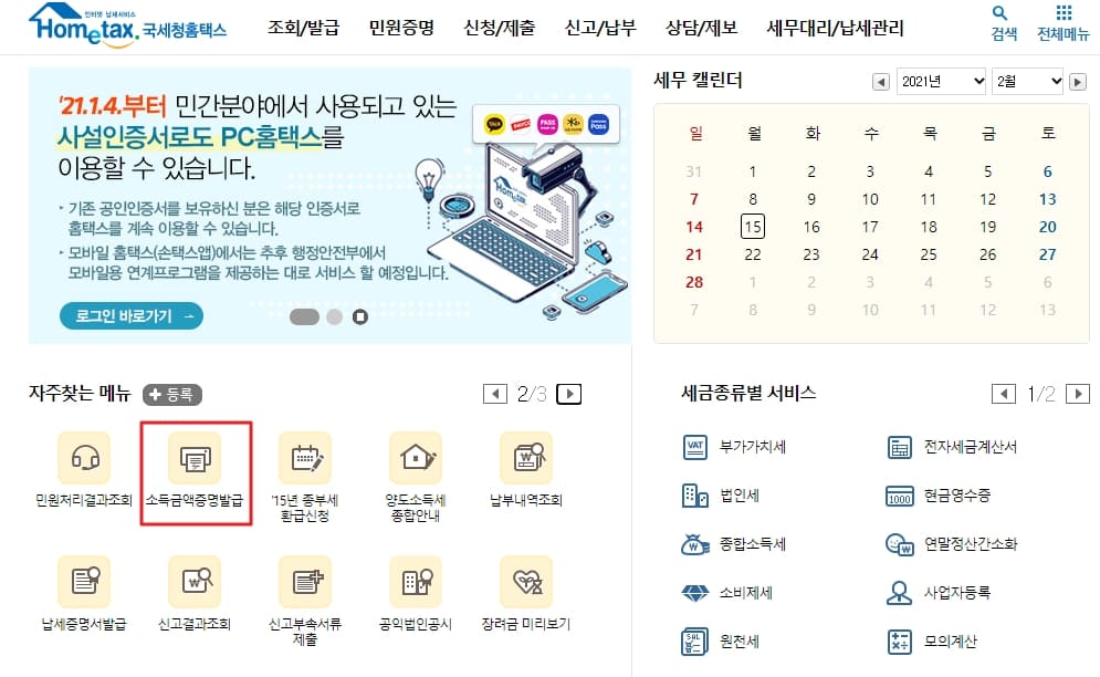 메인화면에서 자주찾는 메뉴의 '소득금액증명발급' 이미지를 클릭해주세요.