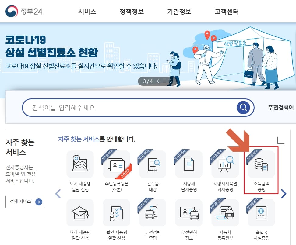 정부24 홈페이지 메인화면에서 상단의 이미지와 같이 빨간색 체크박스를 해둔 부분에 있는 '소득금액 증명'을 클릭해주세요.