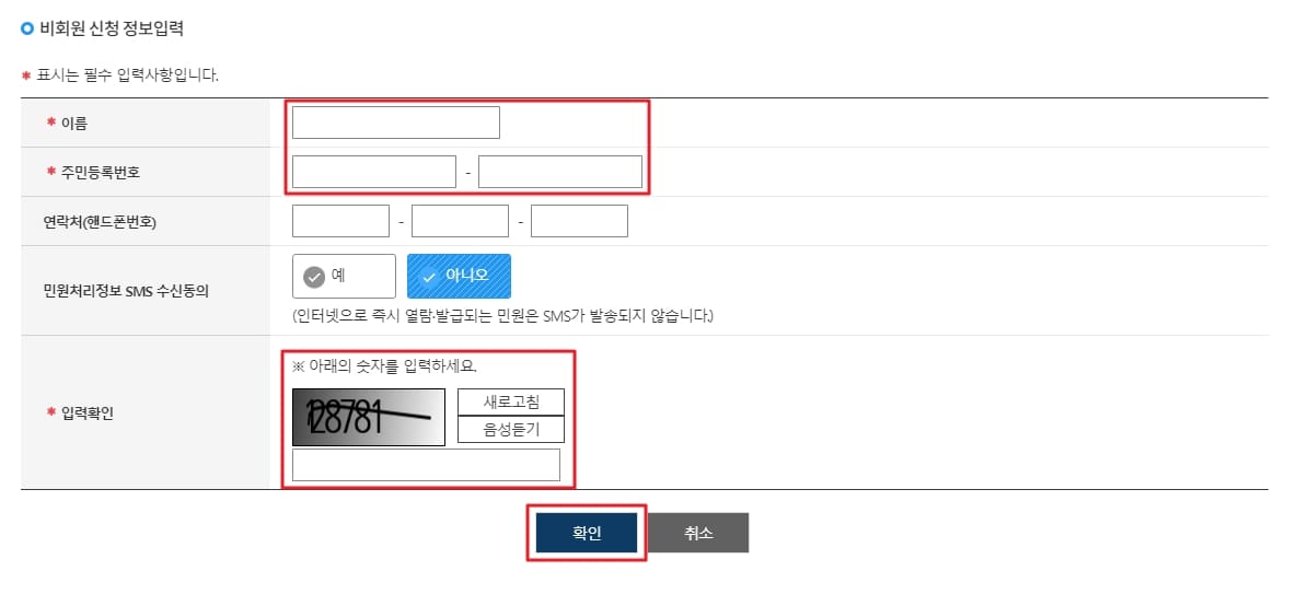 비회원으로 신청하고 있기 때문에 비회원 신청 정보입력도 해주셔야 합니다. 이름, 주민등록번호, 그리고 입력확인 숫자를 기입 후 확인을 클릭해줍니다.