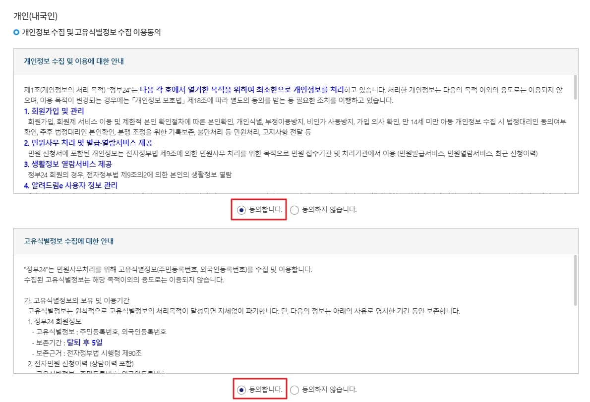 개인정보 수집 및 고유식별정보 수집 이용 동의 안내에 모두 '동의합니다'를 체크해주세요.