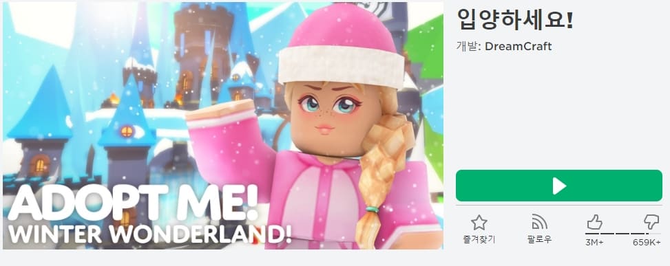 입양하세요 게임을 클릭하면 위와 같은 화면이 뜨게 되는데 초록색 창의 플레이 버튼을 클릭해줍니다. 곧 게임이 시작된다는 창이 뜨면 'Roblox 다운로드 및 설치' 버튼을 클릭해주세요.