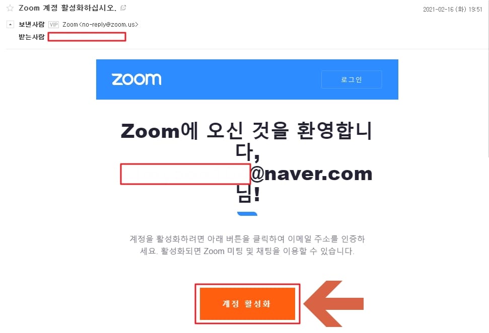 이메일 계정에 로그인해보니 줌에서 메일을 보내준 것을 확인할 수 있었습니다. 화면 하단의 '계정 활성화' 버튼을 클릭해주세요.