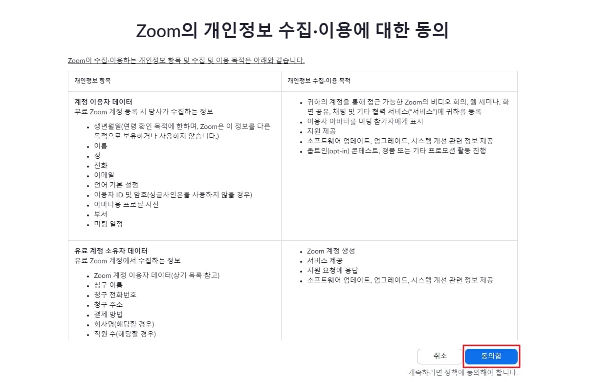 줌 화상회의 다운로드를 사용하기 위해서는 개인정보 수집, 이용에 대한 동의를 해주셔야 합니다. 화면 우측 하단의 파란색 '동의함' 버튼을 클릭해주세요.