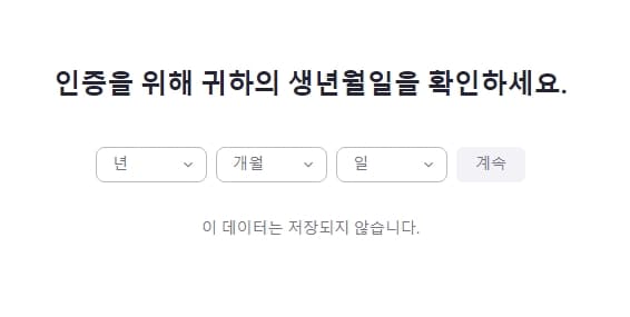 인증을 위해 생년월일을 기입해주셔야 합니다. 데이터는 별도로 저장되지 않는다고 하니 안심하셔도 될듯합니다. 생년월일을 선택해주신 뒤 계속 버튼을 클릭해주세요.