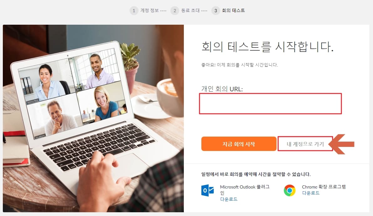 '회의 테스트를 시작합니다' 화면이 뜰텐데 하단의 '내 계정으로 가기' 버튼을 클릭해주세요.