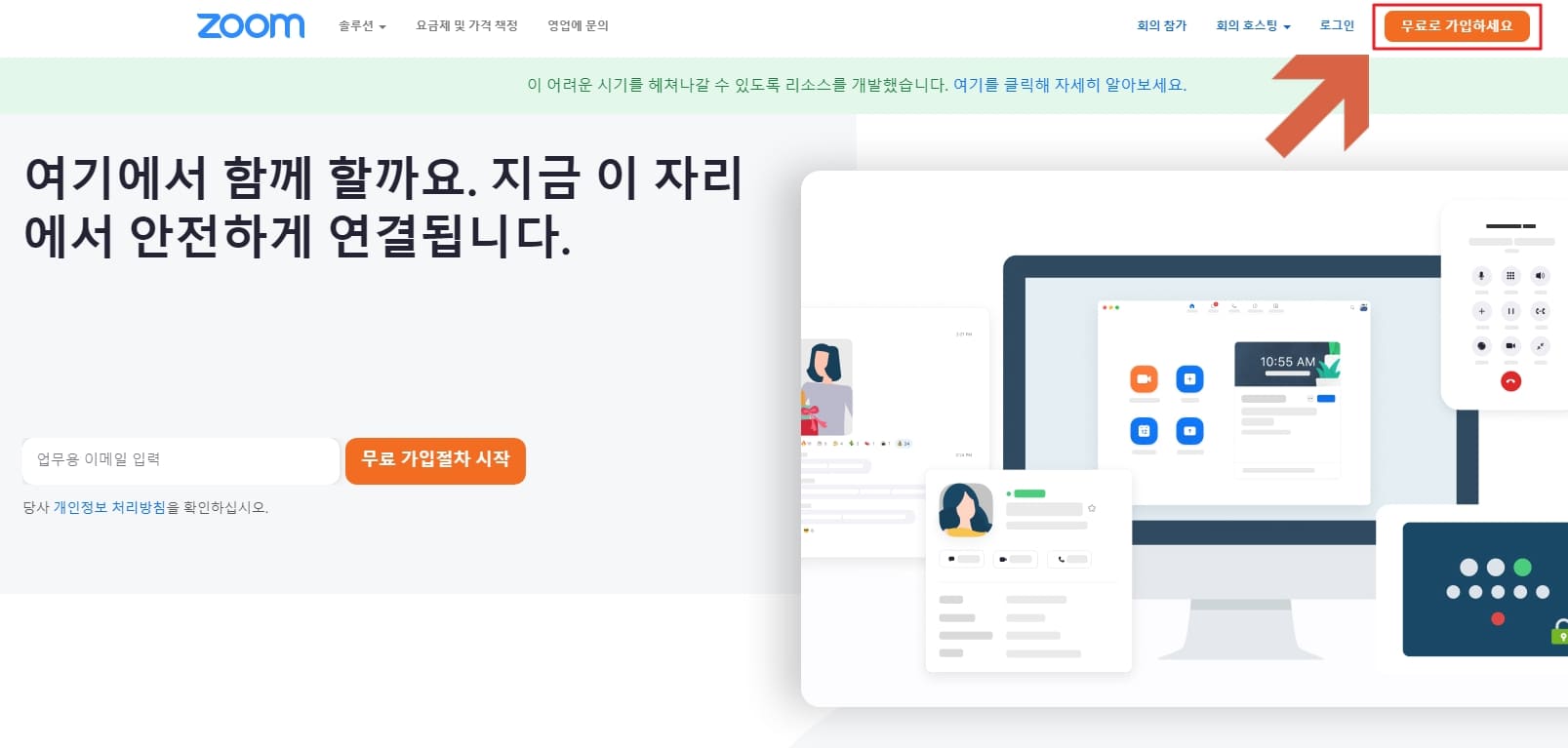 홈페이지 메인 화면에서 우측 상단의 '무료로 가입하세요' 버튼을 클릭해줍니다. 화면 중앙의 '무료 가입절차 시작' 버튼을 클릭하셔도 상관없습니다. 줌은 회원가입을 해야 사용할 수 있기 때문에 필수로 진행해주셔야 한다는 점 참고해주세요.